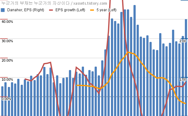 - 포스팅일 기준, 다나허의 1, 5년 연평균 EPS 성장률은 7.56%, -3.57%이다.