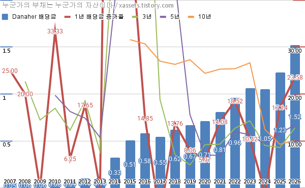 다나허 배당금 및 배당성장률 차트 (2007년~2026년)