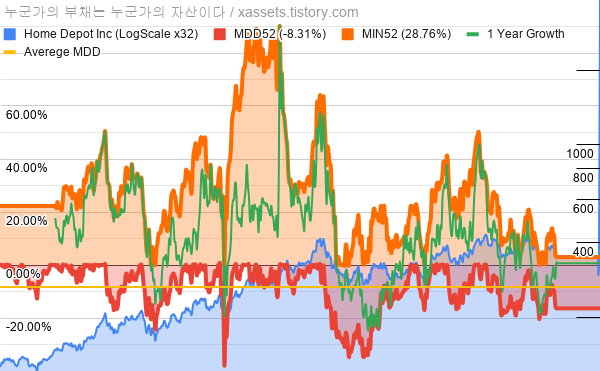 - 홈 디포의 10년 평균 MDD는 -8.31%고, 52주 최저가 대비 평균 상승률은 28.76%다.