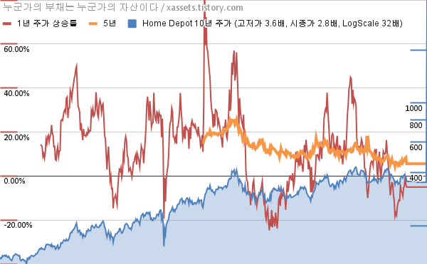 - 포스팅일 기준, 홈 디포의 1, 3, 5, 10년 연평균 주가상승률은 -5.01%, 7.72%, 5.56%, 10.54%이다.