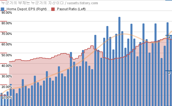 홈 디포 EPS 성장률, 배당성향 차트 (2012년~2026년)