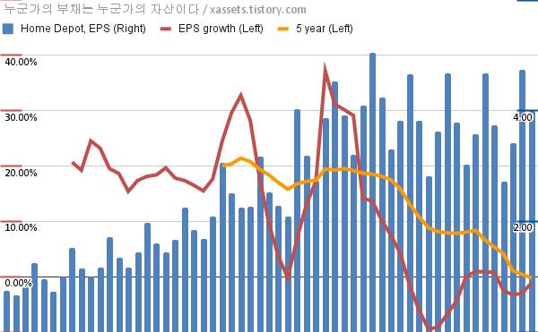 - 포스팅일 기준, 홈 디포의 1, 5년 연평균 EPS 성장률은 -1.07%, -0.25%이다.