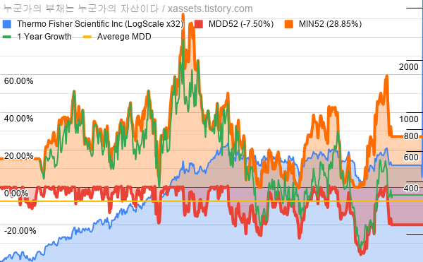 - 써모피셔 사이언티픽의 10년 평균 MDD는 -7.50%고, 52주 최저가 대비 평균 상승률은 28.85%다.