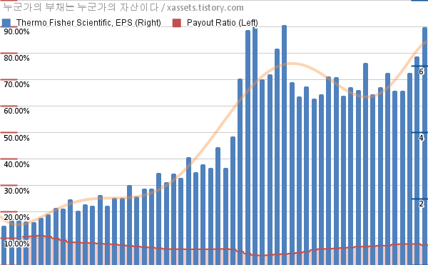 써모피셔 사이언티픽 EPS 성장률, 배당성향 차트 (2012년~2026년)