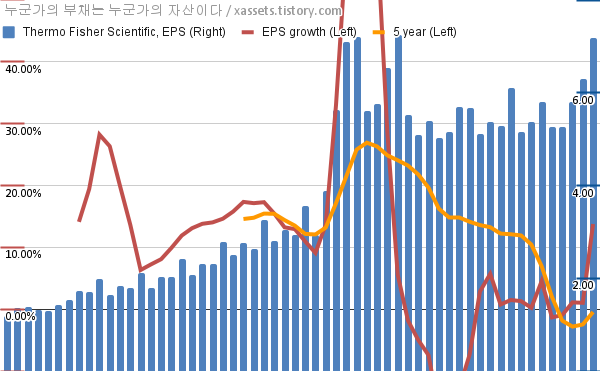 - 포스팅일 기준, 써모피셔 사이언티픽의 1, 5년 연평균 EPS 성장률은 13.77%, -0.46%이다.