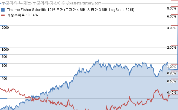 써모피셔 사이언티픽 배당수익률 및 주가 상승률 차트 (2016년~2026년)