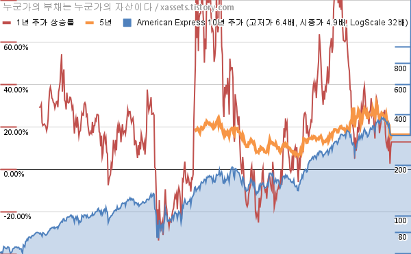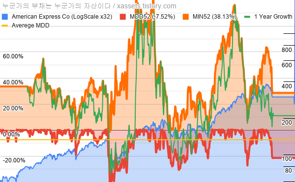 - 아메리칸 익스프레스의 10년 평균 MDD는 -7.52%고, 52주 최저가 대비 평균 상승률은 38.13%다.