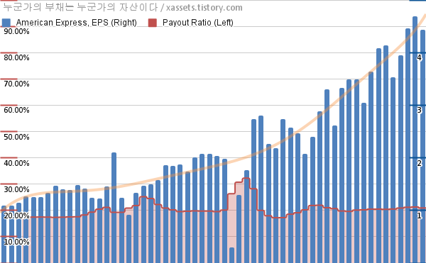 아메리칸 익스프레스 EPS 성장률, 배당성향 차트 (2012년~2026년)
