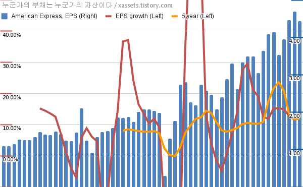 - 포스팅일 기준, 아메리칸 익스프레스의 1, 5년 연평균 EPS 성장률은 13.97%, 11.92%이다.