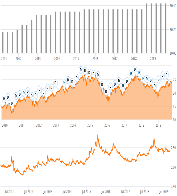 이 주식에는 드러나지 않는 두가지 장점이 있는데 하나는 DRIP 즉 배당재투자 옵션이 있다(따로 의사표현을 하지 않는 이상 배당금으로 주식 매수해 줌)는 것이고 다른 하나는 분기배당이라는 점이다. 분기배당은 받아보면 배당락도 상대적으로 적고, 확실히 느낌이 다르다. 실제적으로 좋은 점은 재투자를 빨리 할 수 있다는 것이다.