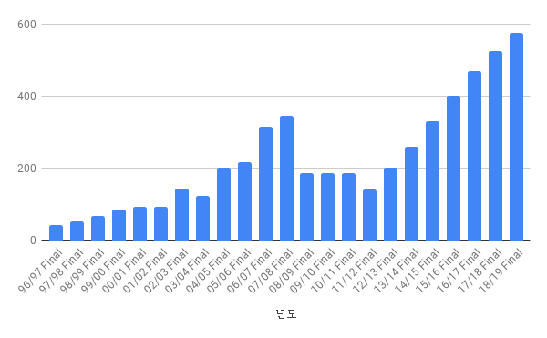 맥쿼리 그룹은 본체 답게 주가 그래프가 정말 이쁘다. 금융위기 이후로는 별 탈없이 계속 올라가고 있다. 보통 이렇게 주가가 오르면 배당수익률이 안 좋을 수 있는데, 구글 검색상 4.3% 정도로 매우 양호한 수준이다. 그래서 홈페이지에 찾아가서 배당금 내역을 찾아 그래프로 그려보니..
