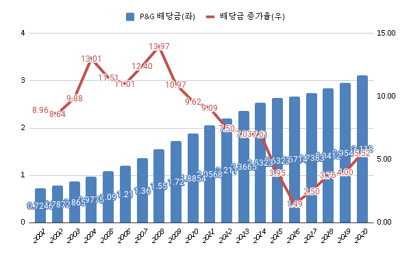 P&G 배당금 & 배당성장률 차트 (2001년~2020년)