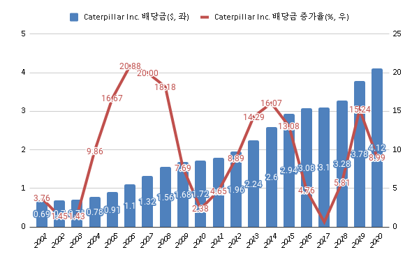 캐터필러 Caterpillar 배당금 & 배당성장률 차트 (2001년~2020년)