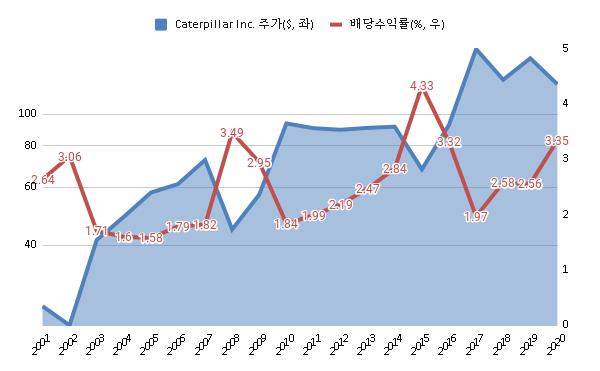 캐터필러 Caterpillar 배당수익률 & 주가 차트 (2001년~2020년)
