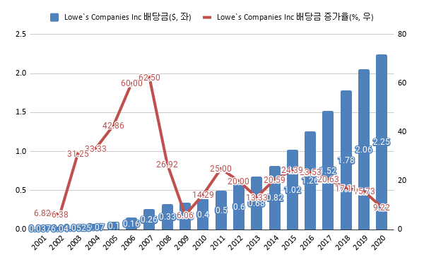 로우스 배당금 & 배당성장률 차트 (2001년~2020년)