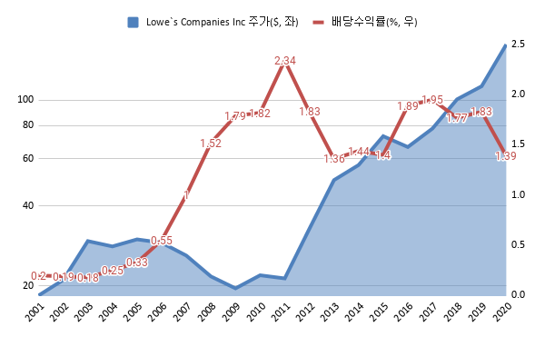 로우스 배당수익률 & 주가 차트 (2001년~2020년)