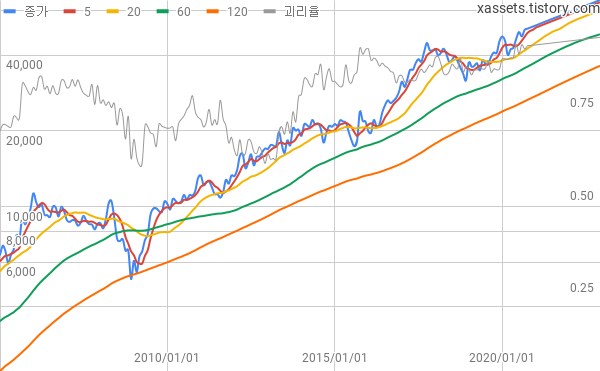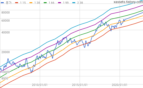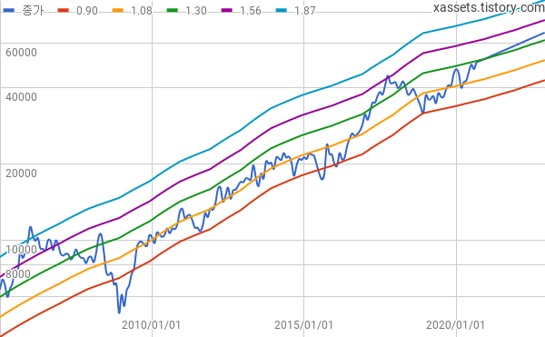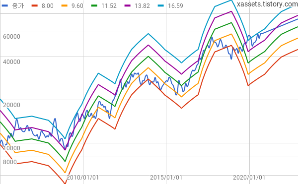 마지막으로 2020년 10월 이후의 주가는 지난 10년 월평균 주가상승률의 80%를 적용한 수치다. 세계 금융위기 이후에 주가가 낮은 상태부터 평균을 낸 거라서 임의로 보정을 좀 했다. 그래도 월평균 1% 언저리가 나와서 잘못 계산한 건가 했었다.