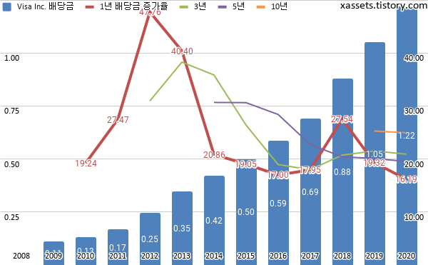 비자 배당금 및 배당성장률 차트 (2008년~2020년)