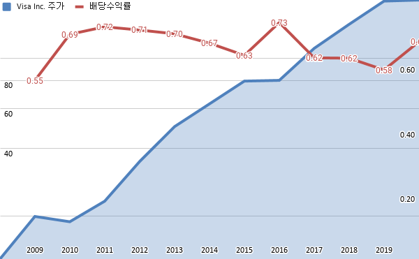 비자 배당수익률 및 주가 차트 (2008년~2020년)