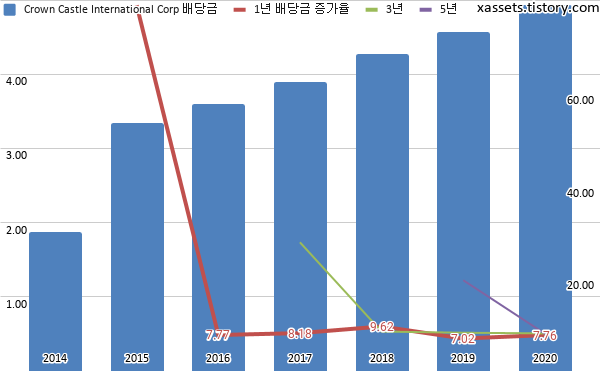 크라운캐슬 인터내셔널 배당금 및 배당성장률 차트 (2014년~2020년)