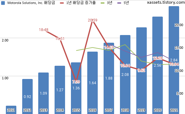 모토로라 솔루션 배당금 및 배당성장률 차트 (2011년~2021년)