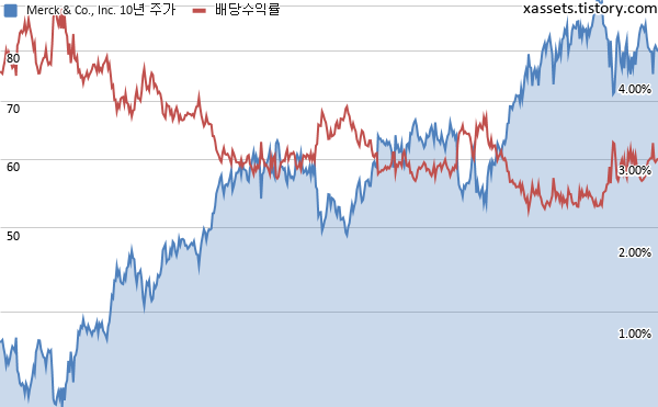 머크(MSD) 배당수익률 및 주가 차트 (2002년~2021년)