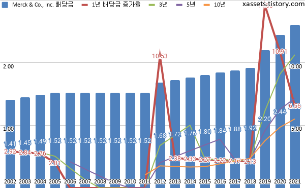 머크(MSD) 배당금 및 배당성장률 차트 (2002년~2021년)