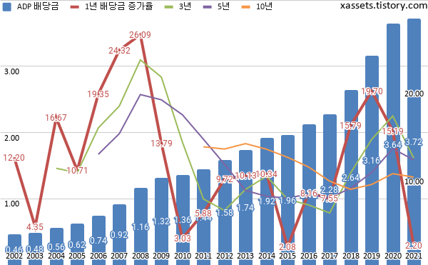 ADP 배당금 및 배당성장률 차트 (2002년~2021년)