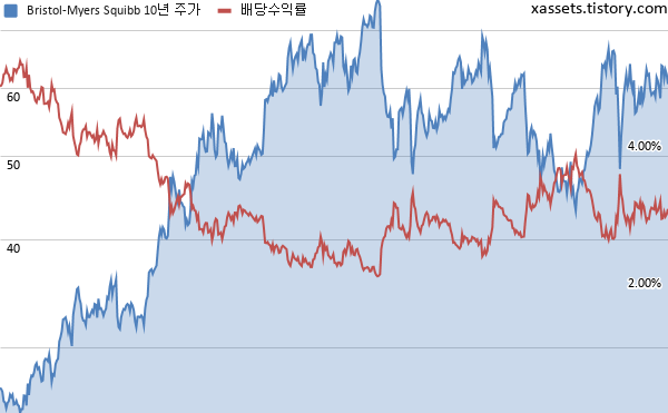 브리스톨-마이어스 스퀴브 배당수익률 및 주가 차트 (2002년~2021년)