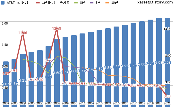 AT&T 배당금 및 배당성장률 차트 (2002년~2021년)