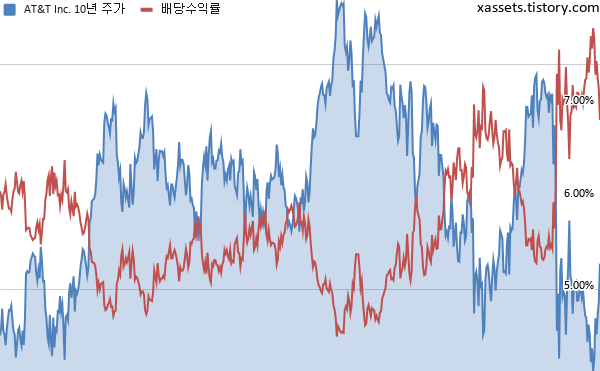 AT&T 배당수익률 및 주가 차트 (2002년~2021년)