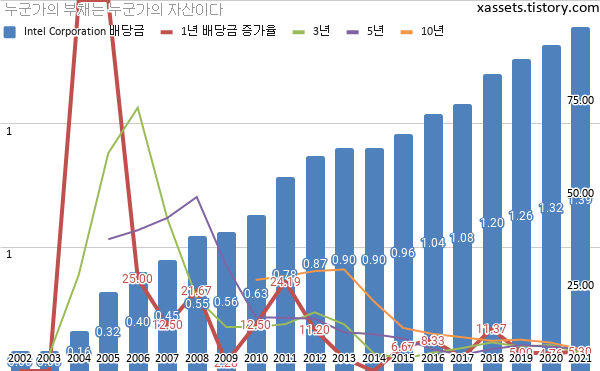 인텔 배당금 및 배당성장률 차트 (2002년~2021년)