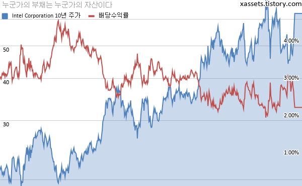 인텔 배당수익률 및 주가 차트 (2010년~2021년)