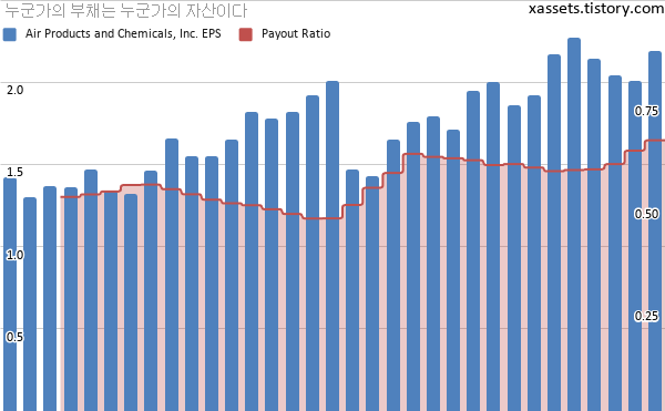 에어프로덕츠 EPS 및 배당성향 차트 (2013년~2021년)