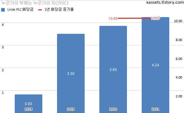 린데 배당금 및 배당성장률 차트 (2018년~2021년)