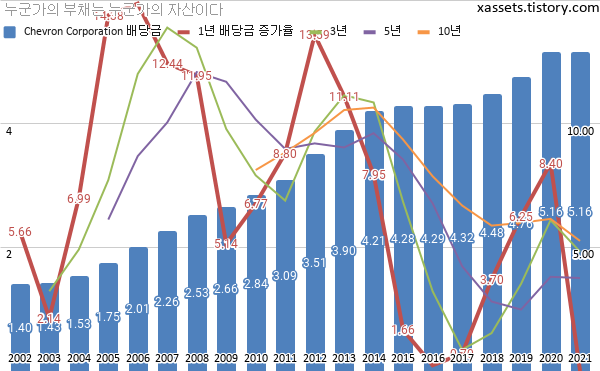 셰브런 배당금 및 배당성장률 차트 (2002년~2021년)