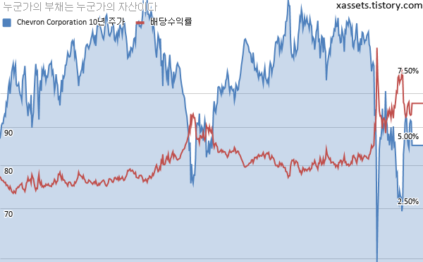 셰브런 배당수익률 및 주가 차트 (2010년~2021년)