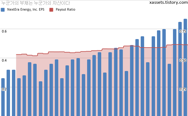 - 넥스테라 에너지는 EPS 그래프가 상당히 안정적이면서 성장성도 충분히 보여주고 있다. 배당성향이 살짝 높아지는 느낌이긴 하지만 NEE가 기본적으로 유틸리티 기업이라는 것을 생각하면 그렇게까지 높은 수준은 아니다. 그리고 EPS 성장률과 배당성장률 추세를 고려하면 배당성향이 하향할 가능성도 충분하다.