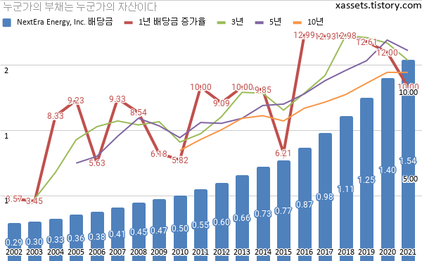 넥스테라 에너지 배당금 및 배당성장률 차트 (2002년~2021년)