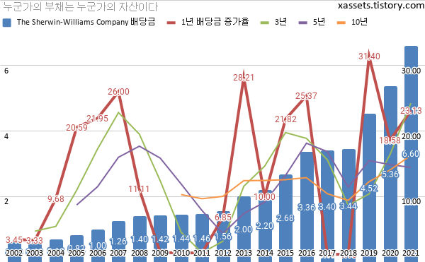 셔윈 윌리엄즈 배당금 및 배당성장률 차트 (2002년~2021년)