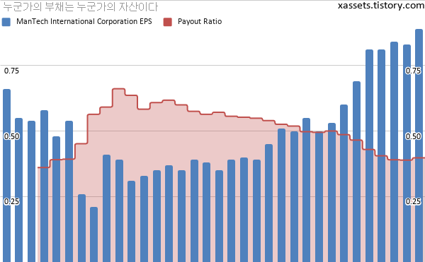 - 배당금 내역을 보면, 맨테크는 연간 $0.84의 배당금을 유지하다가 2018년부터 배당금을 늘리기 시작했는데, 한해를 제외하면 거의 20%에 가깝게 배당금을 늘려주고 있다. 미국 회사들은 배당금을 늘려주기 시작하는 경우 꽤 오랫동안 배당금을 비슷하게 늘려준다. 물론 그렇지 않은 경우도 있다.