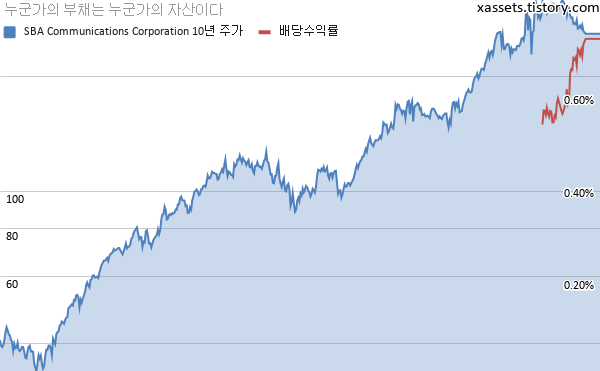 SBA 커뮤니케이션스 배당수익률 및 주가 차트 (2010년~2021년)