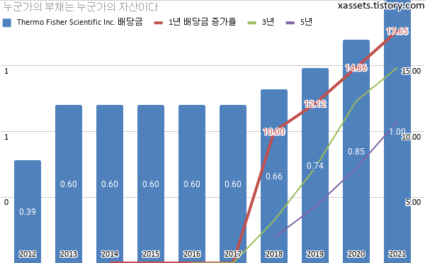 써모피셔 사이언티픽 배당금 및 배당성장률 차트 (2012년~2021년)