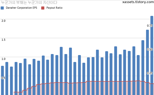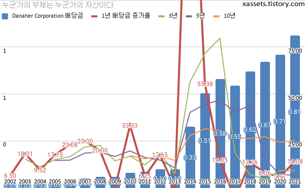 다나허 배당금 및 배당성장률 차트 (2002년~2021년)