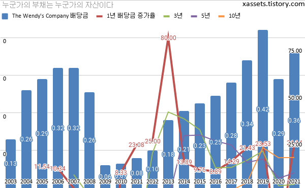 웬디스 배당금 및 배당성장률 차트 (2003년~2021년)
