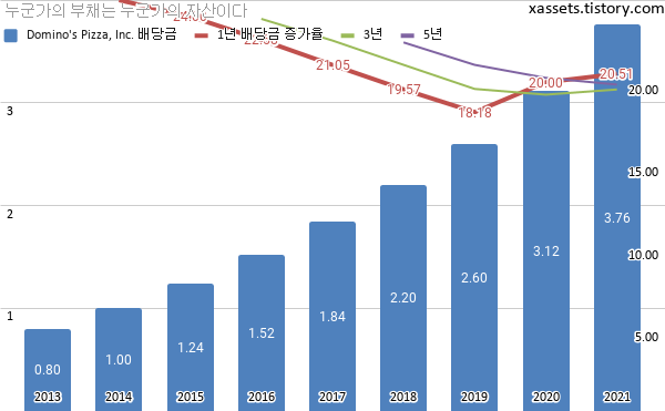 - 도미노피자의 2021년 1분기 기준 1, 3, 5년 평균 배당성장률은 20.51%, 19.56%, 19.86%이다.
