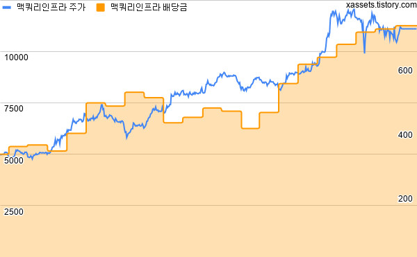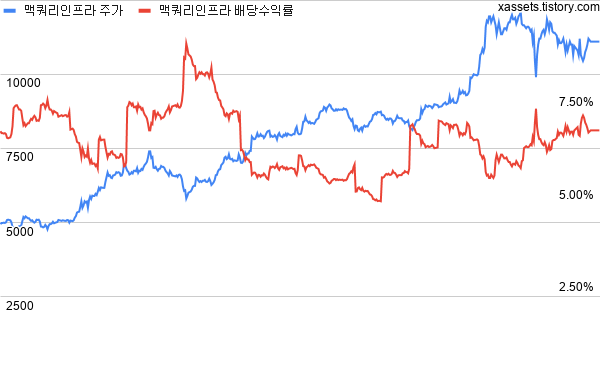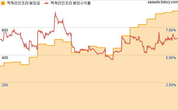 지난 맥쿼리인프라 주가, 배당금, 배당수익률 차트