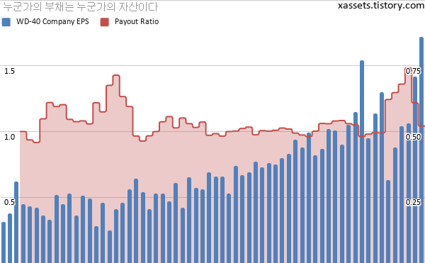 WD-40 EPS 및 배당성향 차트 (2005년~2021년)