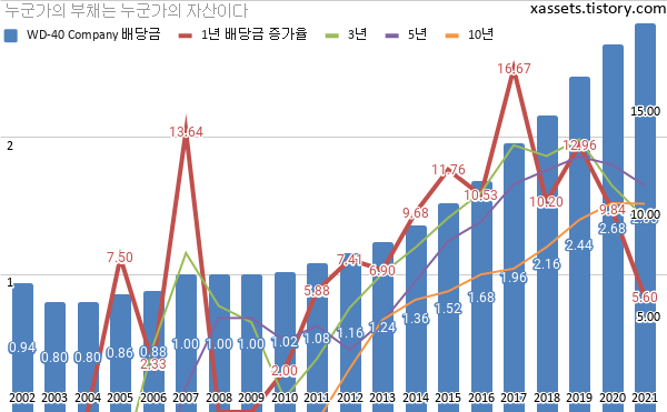 - WD-40의 2021년 기준 1, 3, 5, 10년 평균 배당성장률은 5.60%, 9.42%, 10.99%, 10.11%이다.