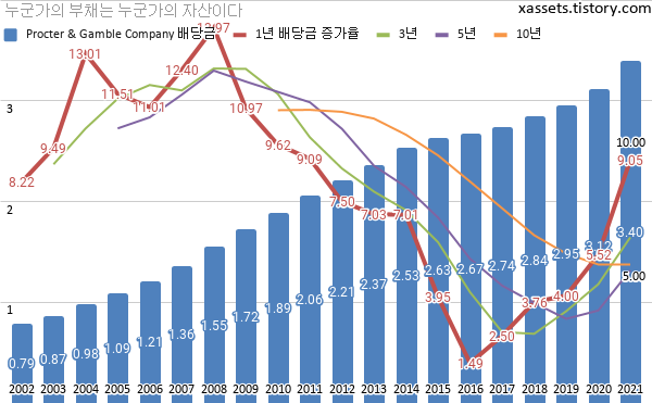- 프록터앤갬블의 2021년 기준 1, 3, 5, 10년 평균 배당성장률은 9.05%, 6.17%, 4.94%, 5.16%이다.